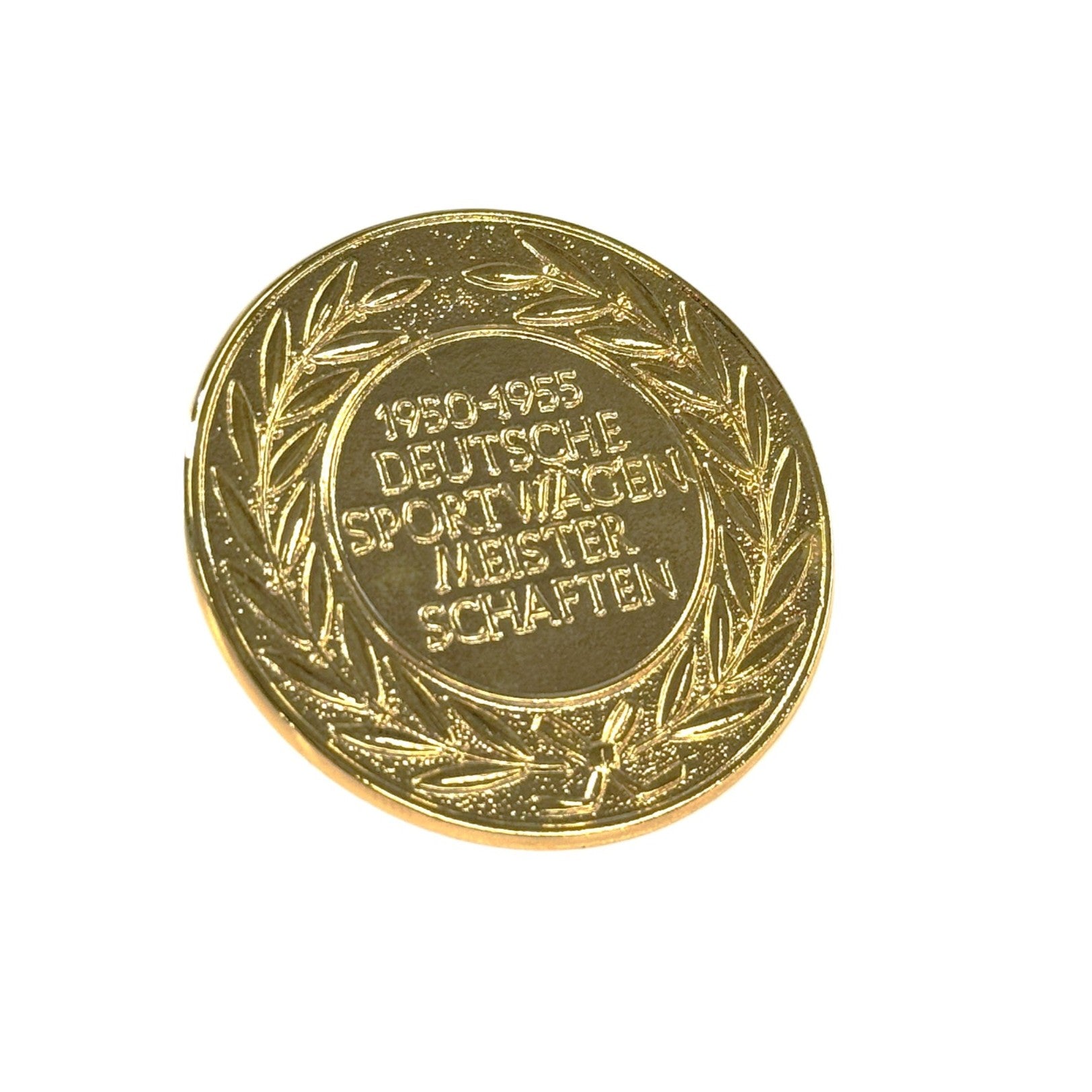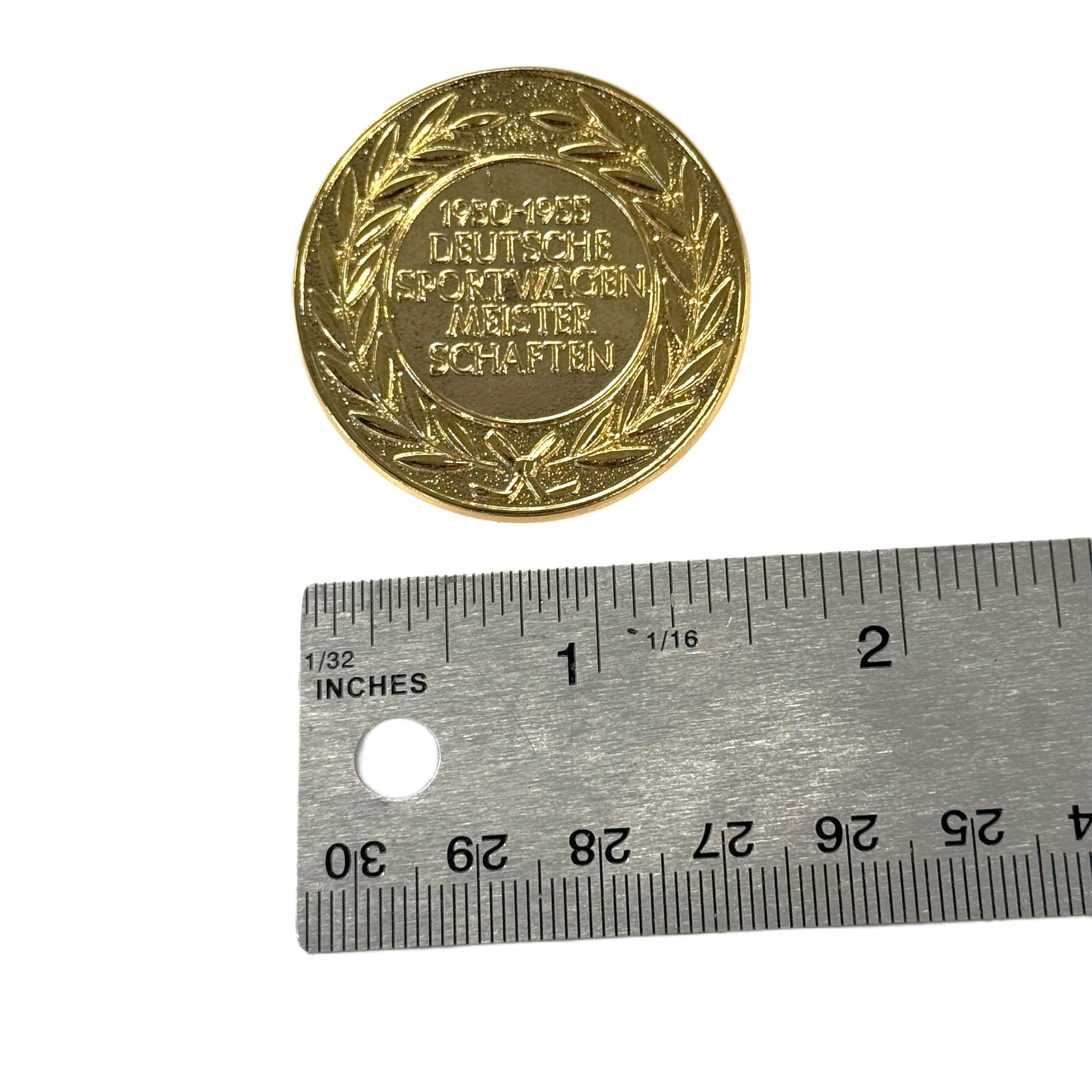 Reproduction 1950-1955 DEUTSCHE SPORTWAGEN MEISTERSCHAFTEN Emblem for 356 Pre-A 1955-1956. Gold tone finish with fastening hardware.