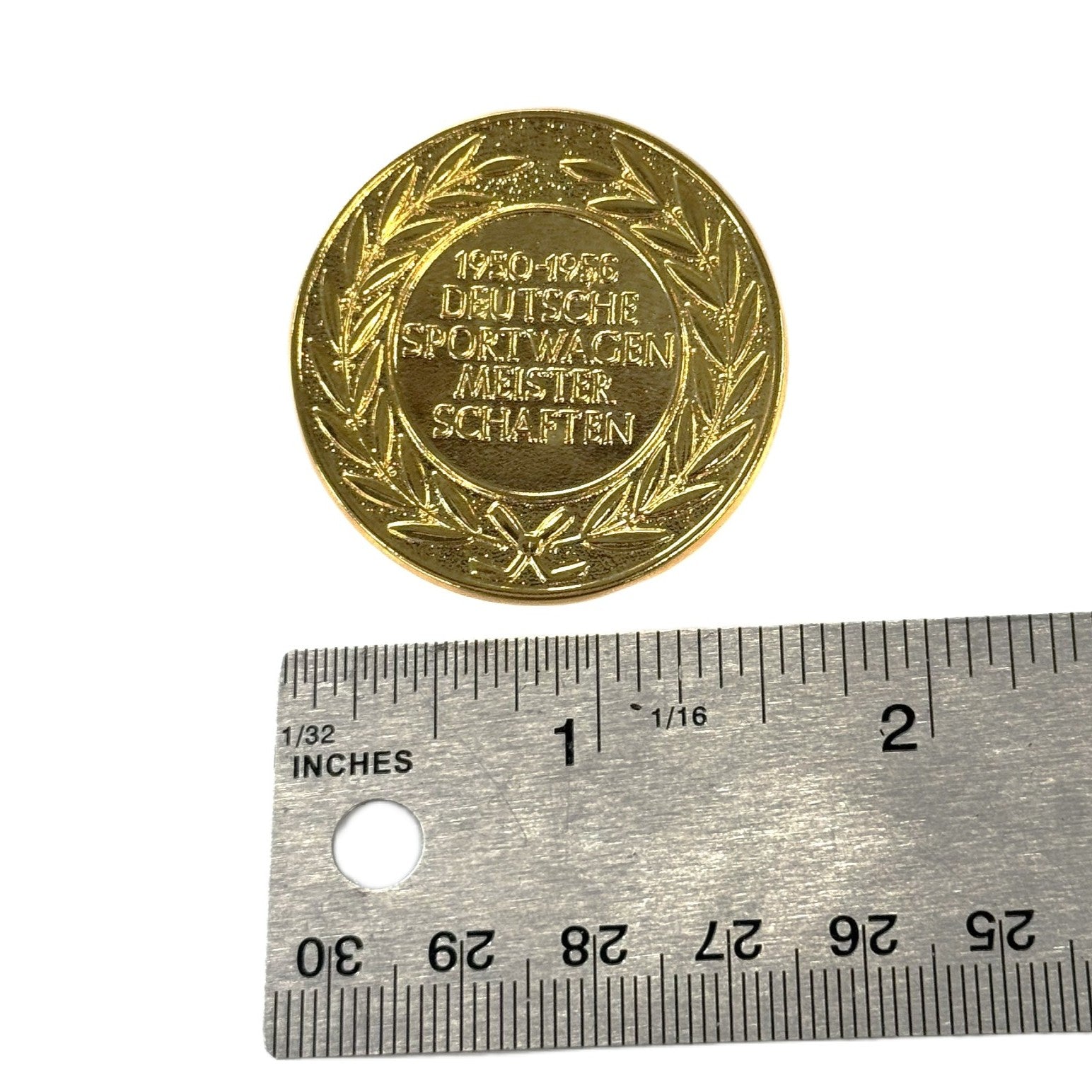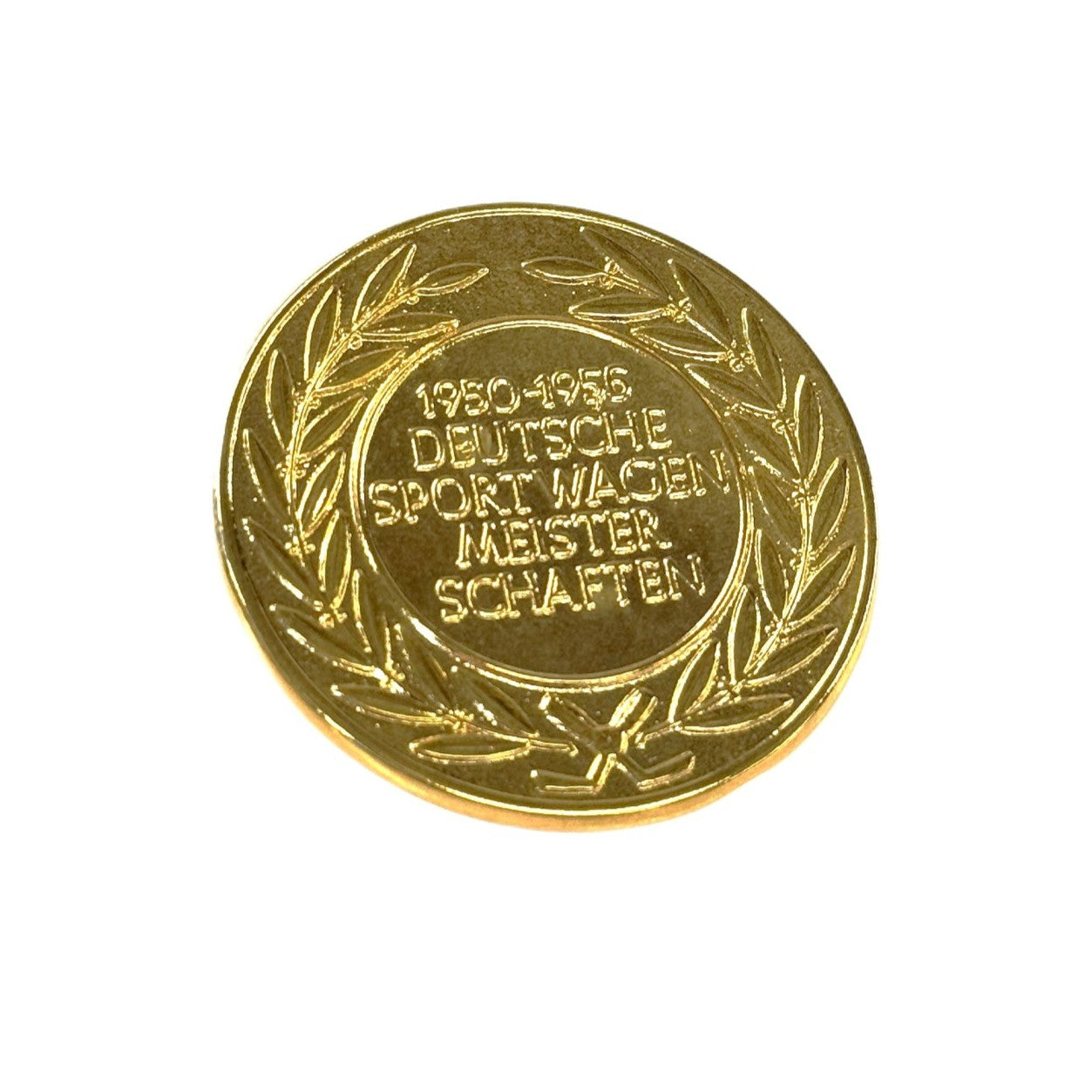 Reproduction 1950-1957 DEUTSCHE SPORTWAGEN MEISTERSCHAFTEN Emblem for 356A (Early T1) 1956-1957. Gold tone finish with fastening hardware.